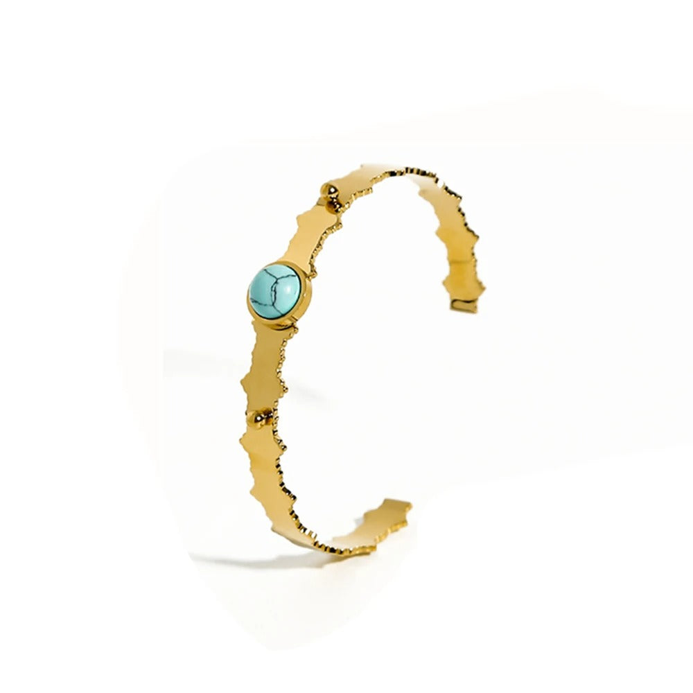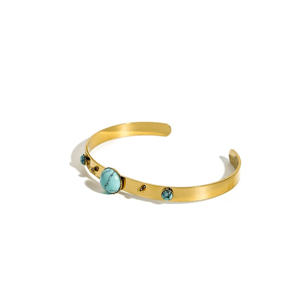 Apyrankė iš nerūdijančio plieno su auksinės spalvos padangimu ir įstatytu natūraliu akmeniu. Atvira konstrukcija užtikrina patogų ir lengvą nešiojimą. Puikiai tinka kasdienai ir šventinėms progoms. Apyrankės apimtis yra apie 19 cm.